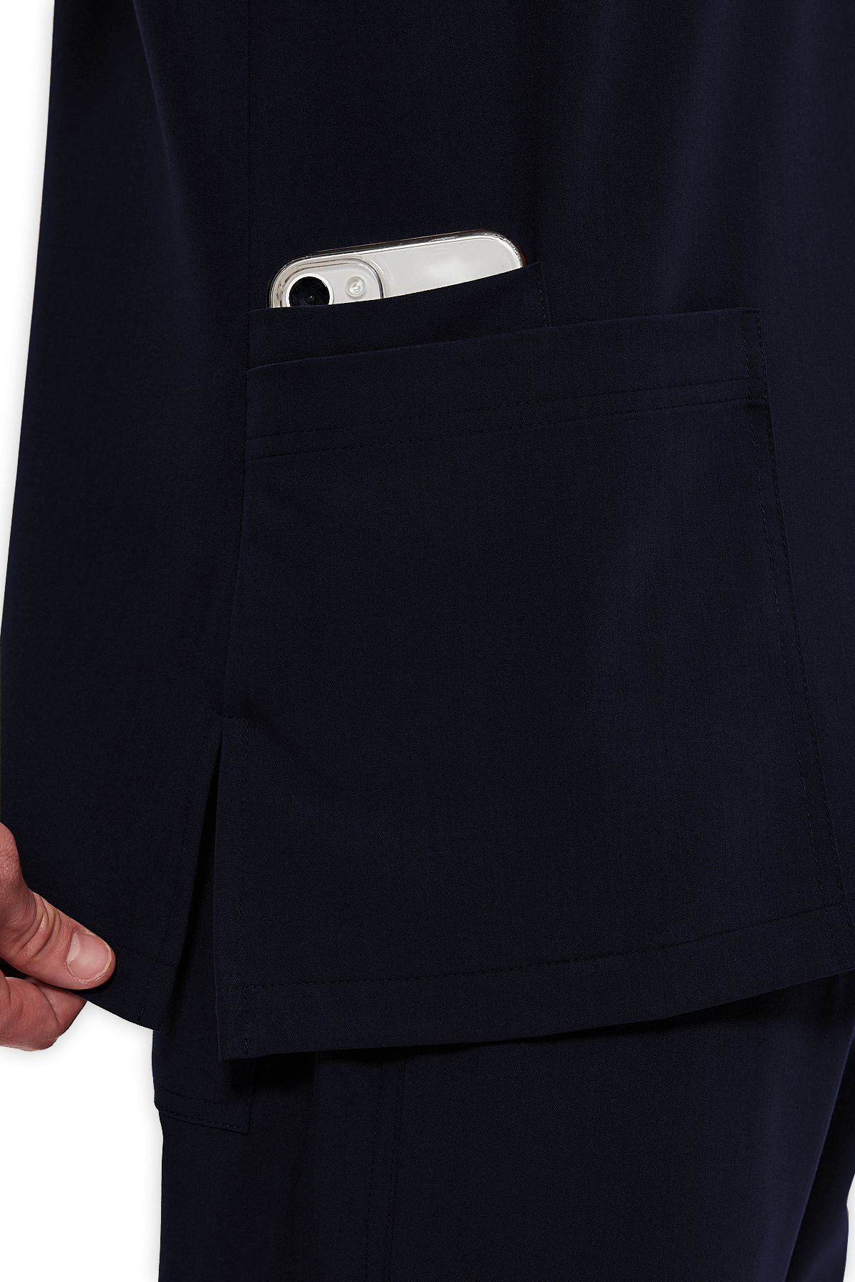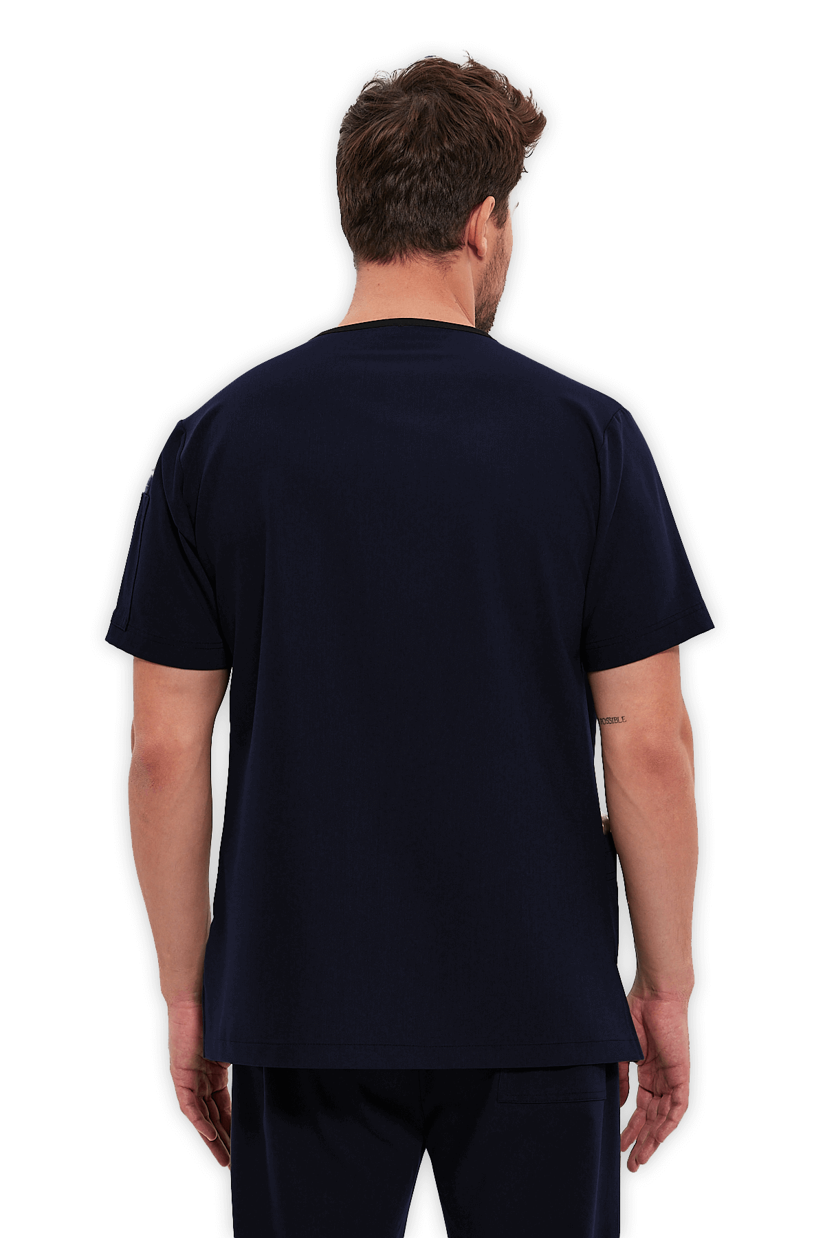 Fonksiyonel Erkek Scrubs Üst 5–Cepli – Lacivert, V yaka, 1 göğüs cebi, 1 kol cebi ve 4 alt cep (1 telefon cebi dahil) ile maksimum pratiklik sunar. Yırtmaçlı tasarım ile sağlık çalışanlarının 1 numaralı tercihi!