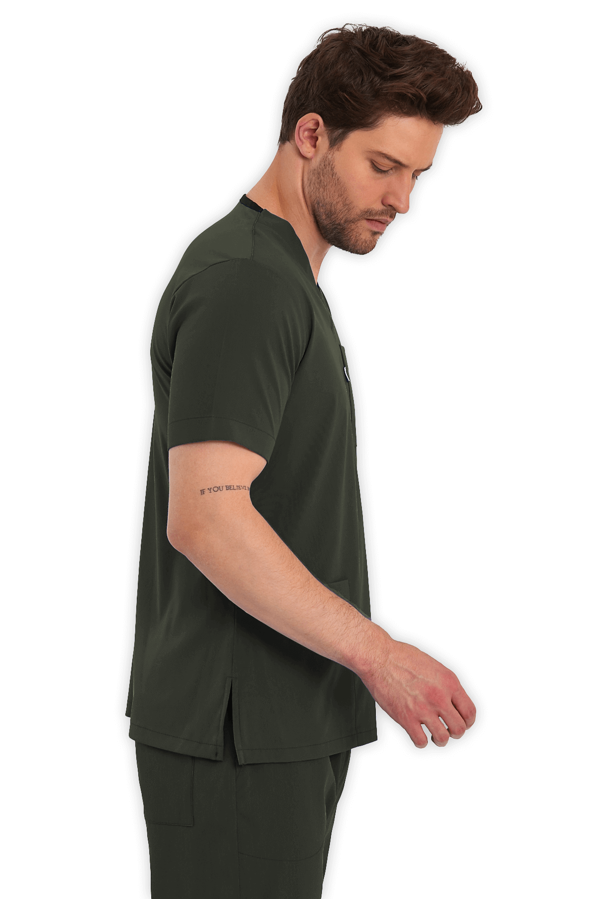 Erkek Scrubs Üst – Haki, V yaka, 1 göğüs cebi, 2 alt cep ve yırtmaçlı tasarımıyla hem rahat hem işlevsel. Gün boyu konfor, sağlık çalışanları için ideal seçim!