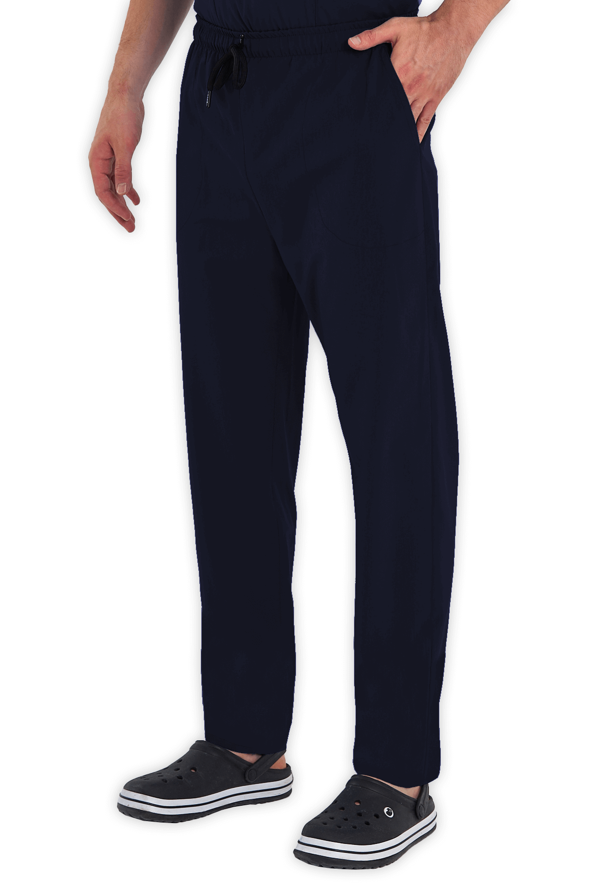 Konforlu Erkek Scrubs Pantolon – Lacivert, beli lastikli ve bağcıklı tasarımıyla hareket özgürlüğü sunar. 2 yan cep ve 1 arka cep ile sağlık çalışanları için pratik kullanım!