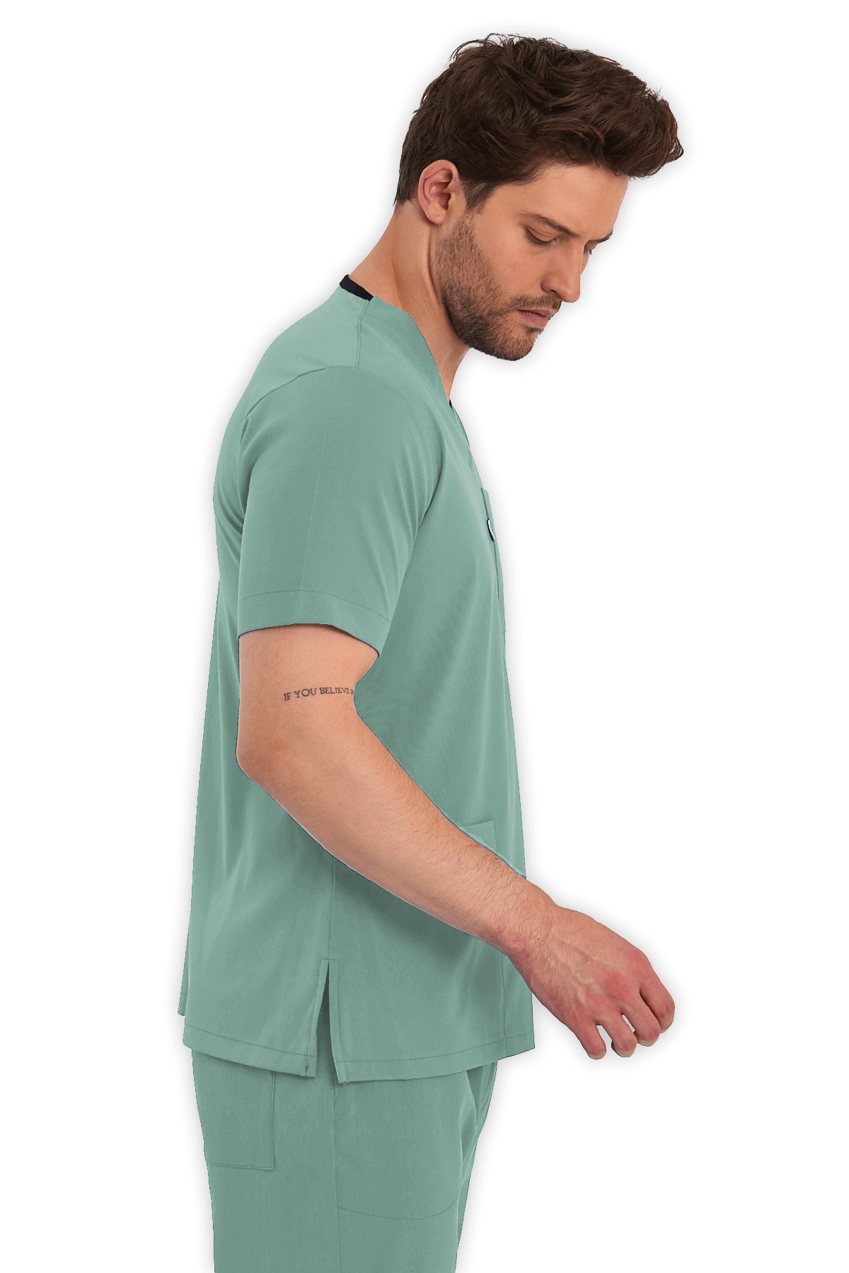 Erkek Scrubs Üst – Mint Yeşili, V yaka, 1 göğüs cebi, 2 alt cep ve yırtmaçlı tasarımıyla hem rahat hem işlevsel. Gün boyu konfor, sağlık çalışanları için ideal seçim!