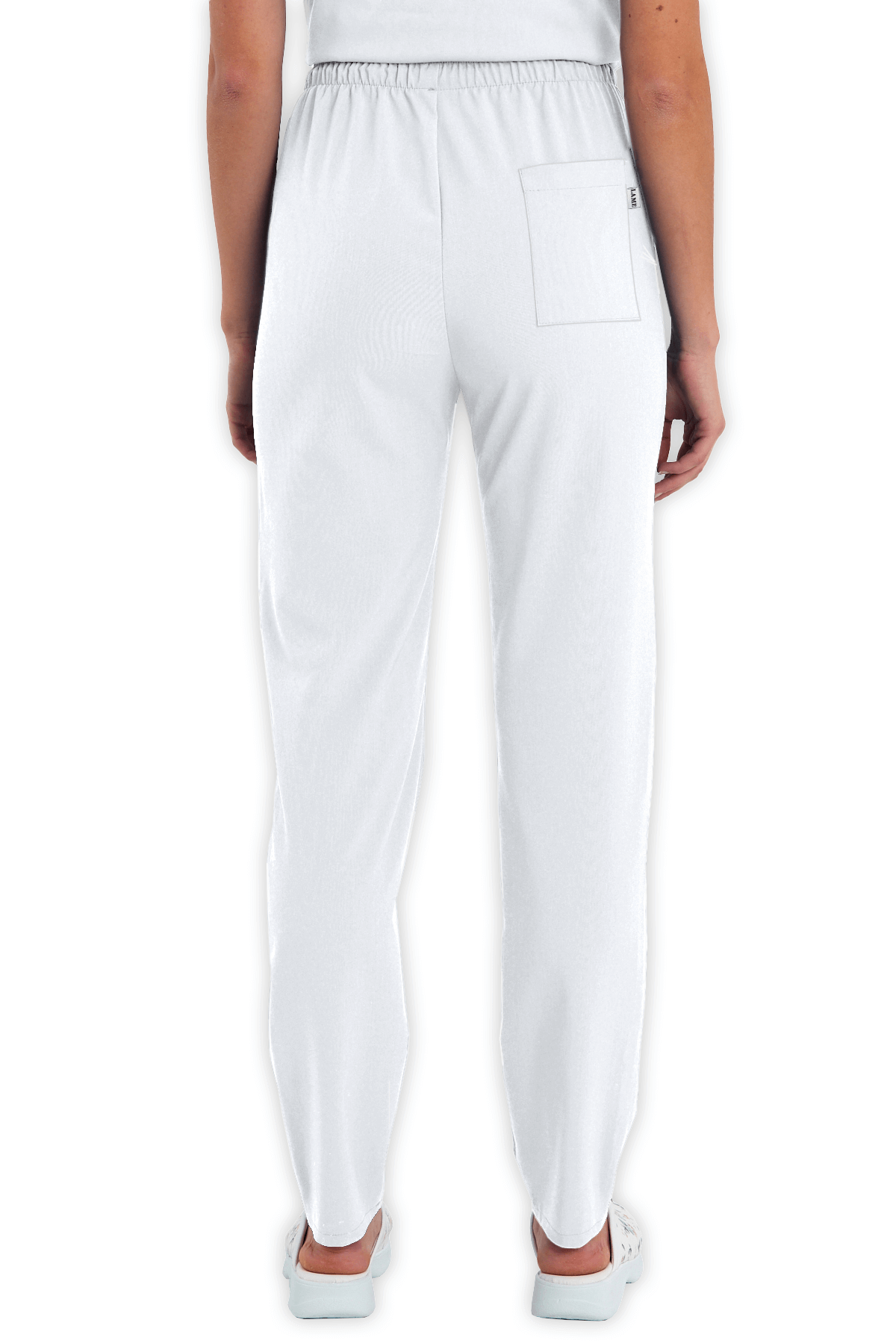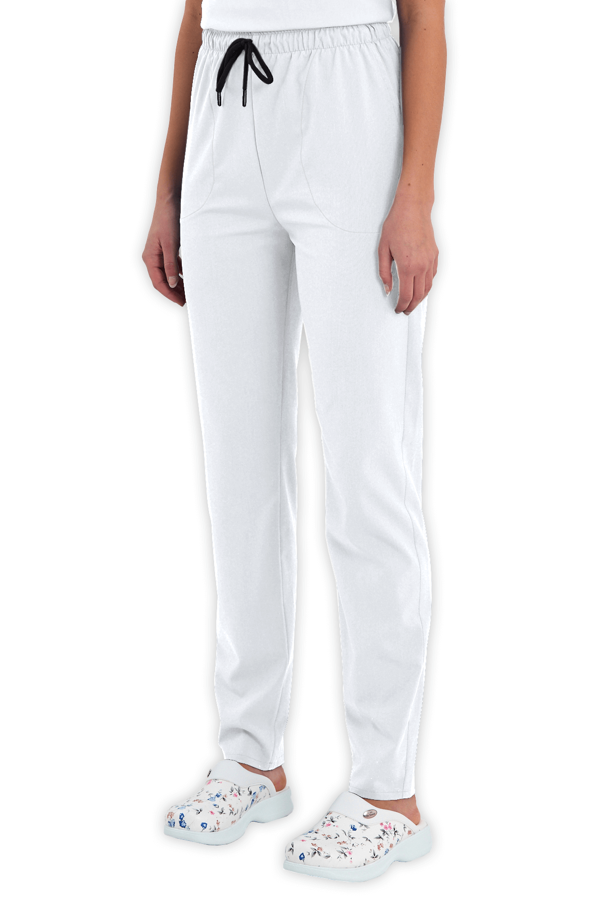 Rahat Kadın Scrubs Pantolon – Beyaz, beli lastikli ve bağcıklı tasarımıyla sağlık çalışanlarına hareket özgürlüğü sağlar. 2 yan cep ve 1 arka cep ile işlevsel kullanım!