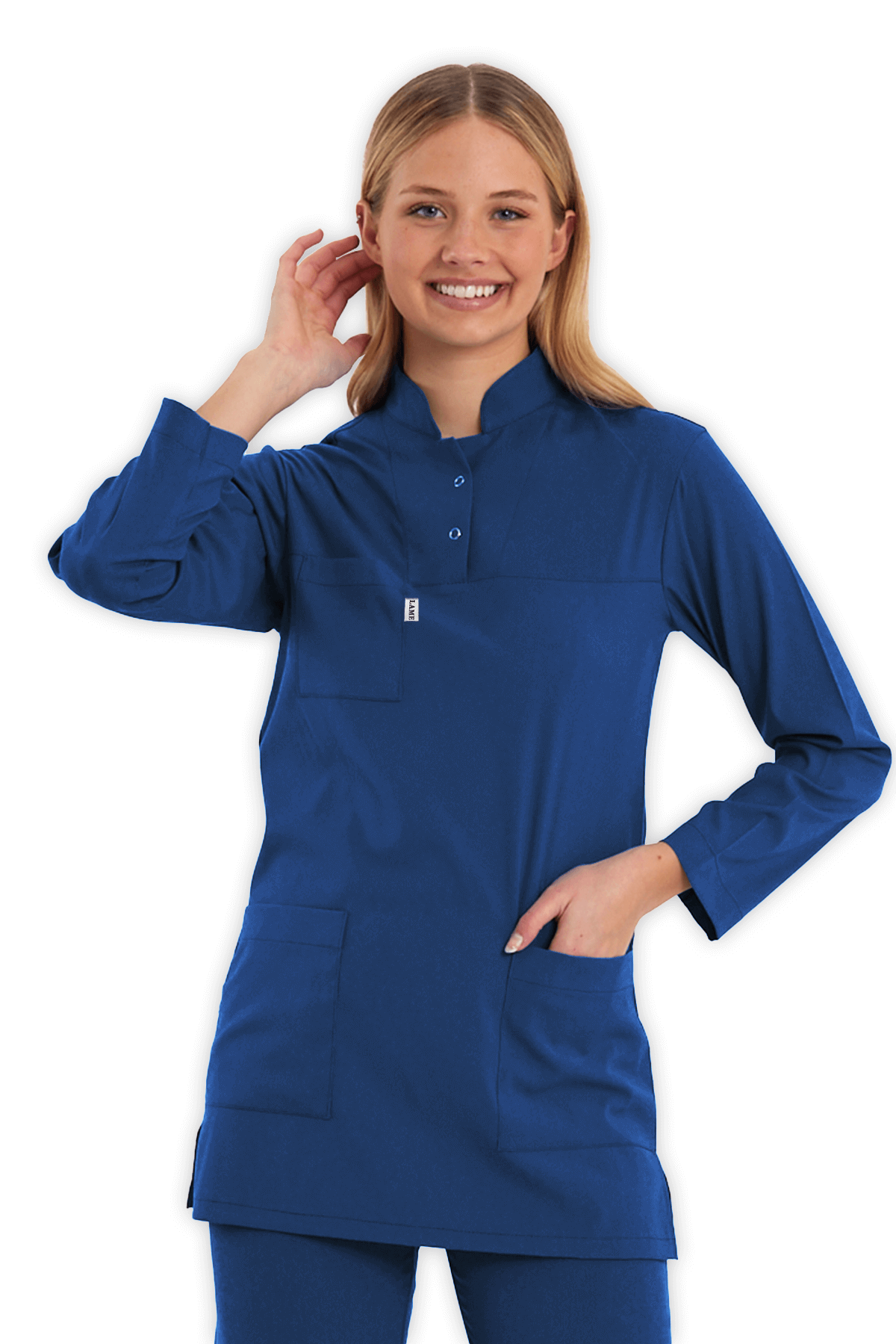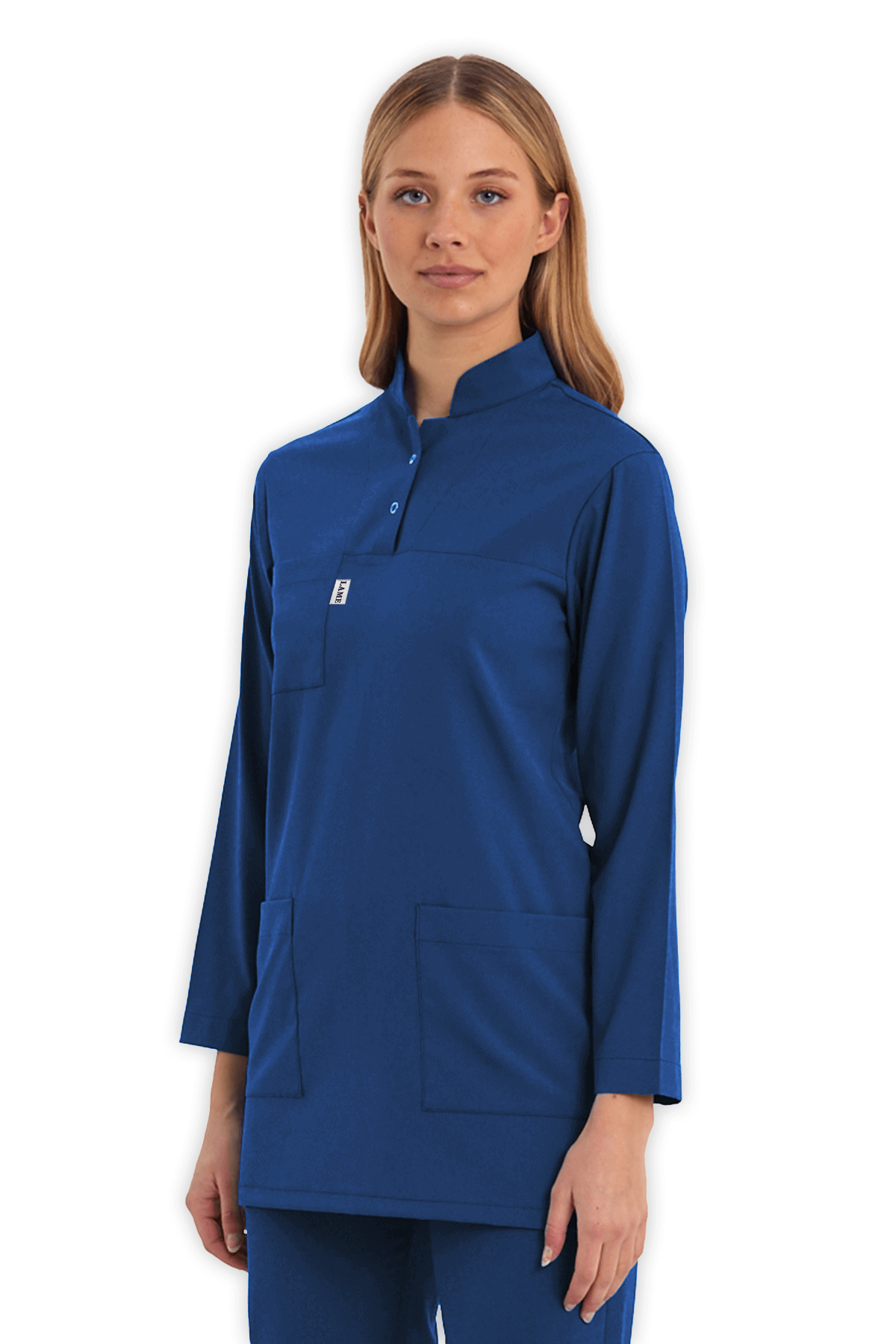 Konforlu Tesettür Scrubs Üst – Petrol Mavisi, hakim yaka, uzun kol ve tunik boy tasarımıyla şıklık sunar. 1 göğüs cebi, 2 alt cep ve yırtmaçlı yapısıyla sağlık çalışanları pratik ve zarif tasarım!