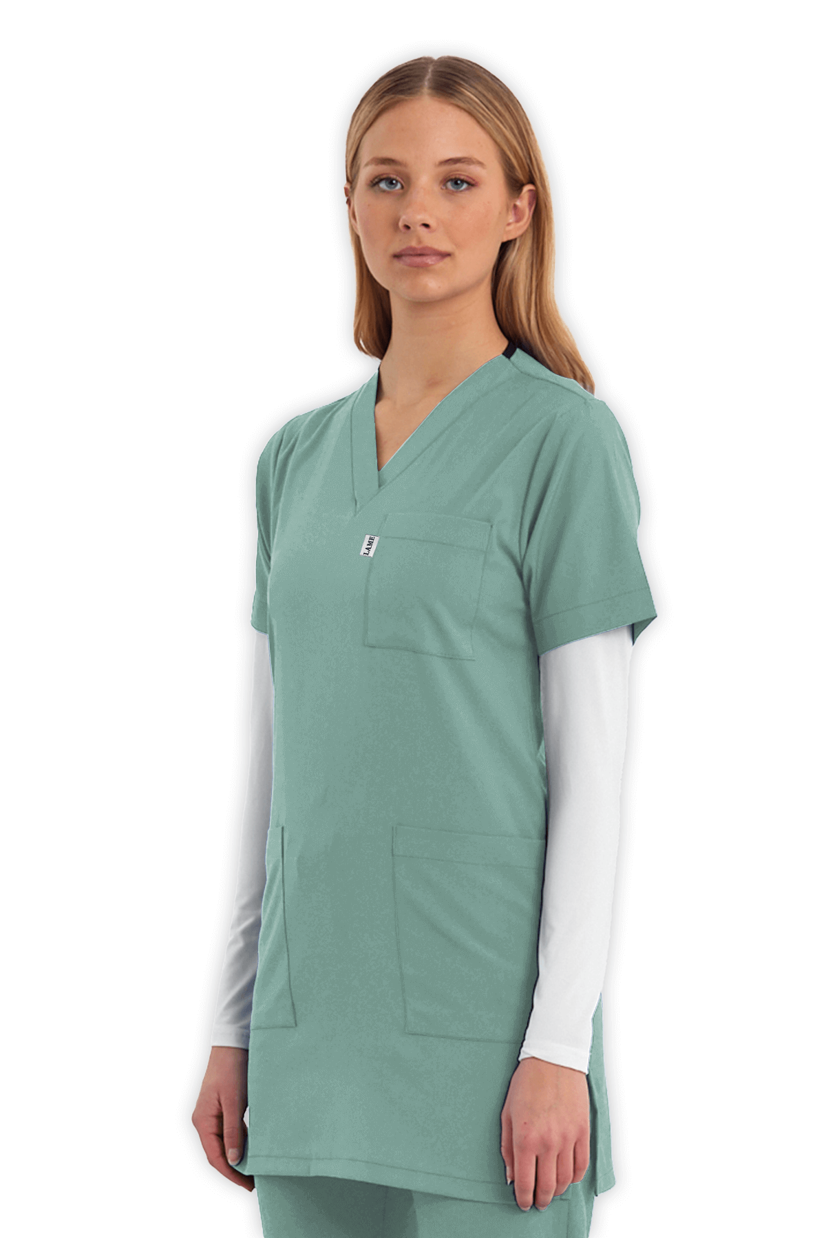 Rahat Tunik Scrubs Üst – Mint Yeşili, V yaka ve tunik boy tasarımıyla öne çıkar. 1 göğüs cebi, 2 alt cep ve yırtmaçlı yapısıyla sağlık çalışanları için hem şık hem pratik!
