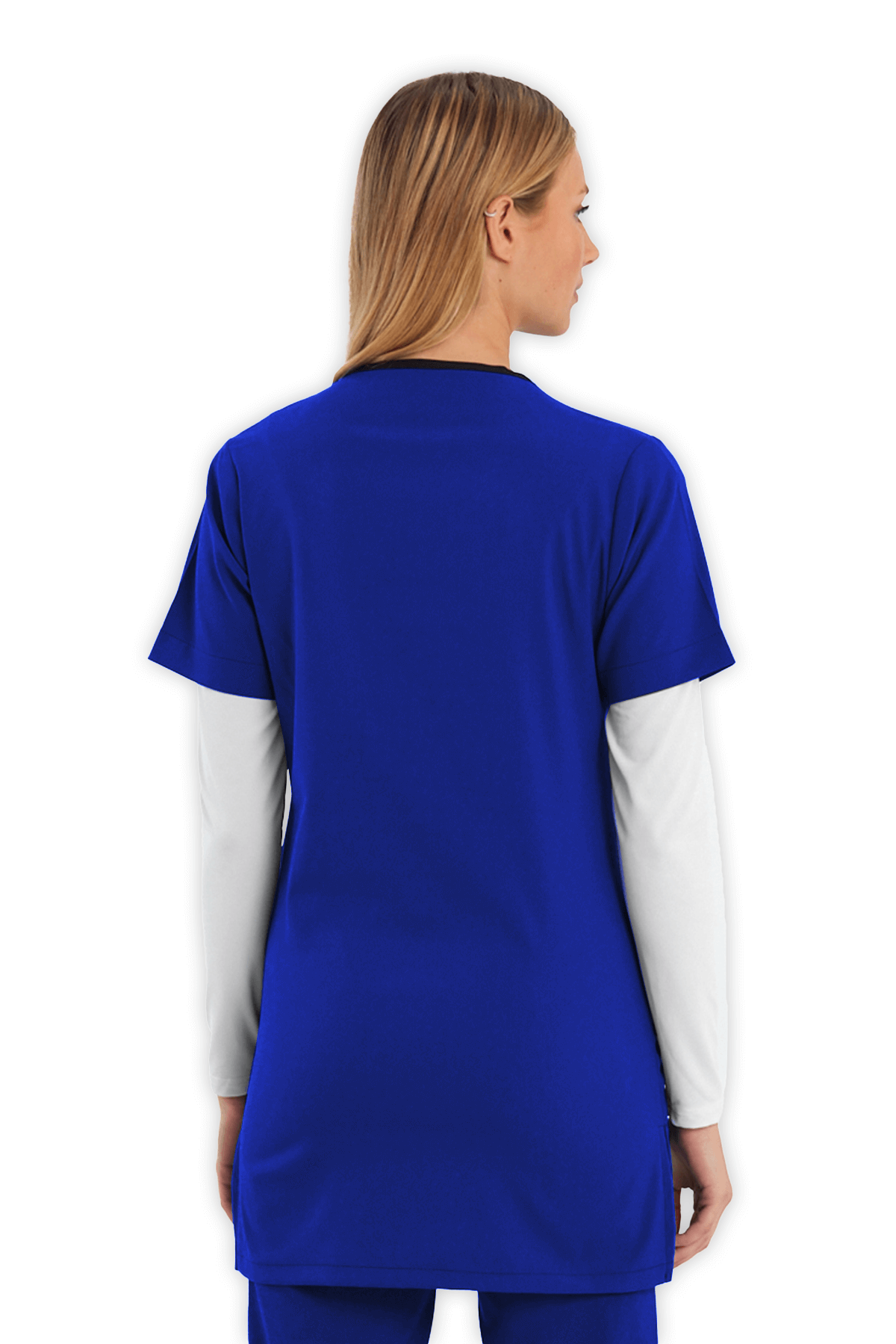 Elegan Tunik Scrubs Takım – Saks Mavisi, V yaka tunik boy üst ve beli lastikli pantolon ile rahatlık sağlar. 1 göğüs cebi, 2 alt cep ve yırtmaçlı tasarım ile sağlık çalışanları için şıklık ve işlevsellik bir arada!